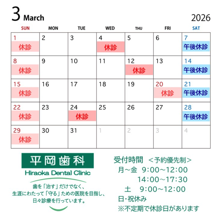 【大分市の歯医者|平岡歯科】3月の診療日のお知らせ