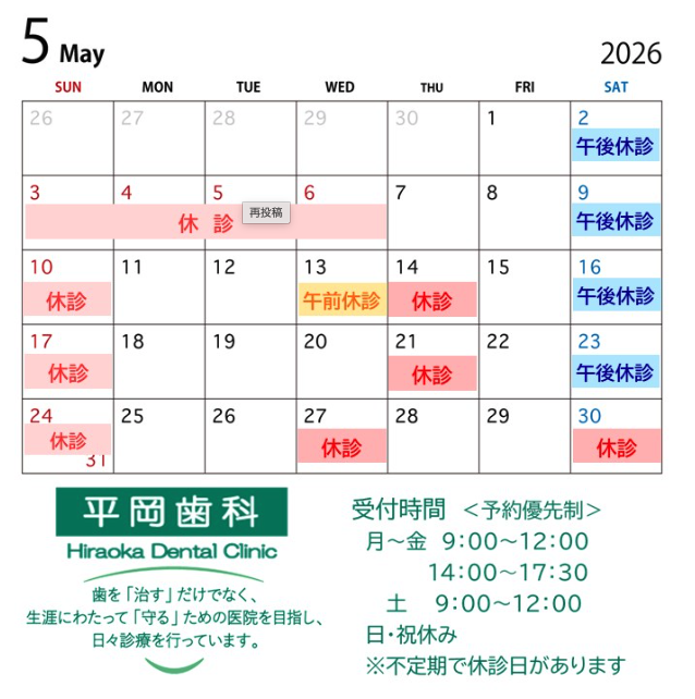 【大分市の歯医者|平岡歯科】5月の診療日のお知らせ
